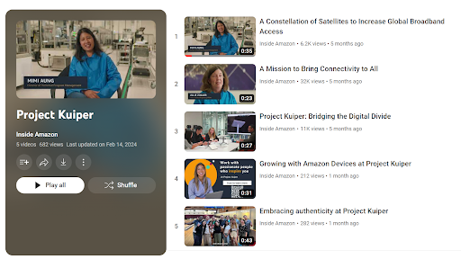 For instance, they have an official YouTube channel (Inside Amazon) that shares employees’ experiences in the company and even information on key projects. Check out their YouTube miniseries on Project Kuiper.