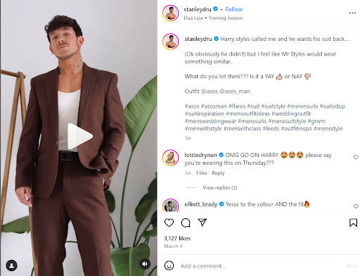 The brand encourages customers to share photos of themselves wearing ASOS clothing on social media using specific hashtags. By doing so, ASOS creates a sense of community and authenticity while also leveraging UGC as valuable social proof to drive sales.