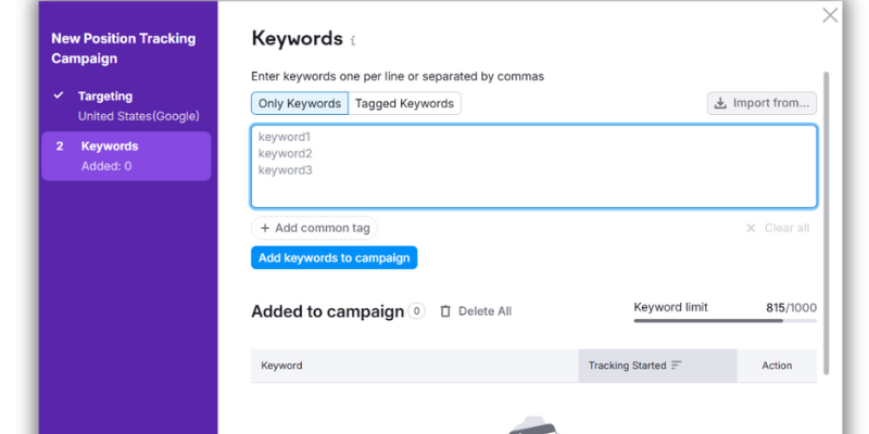 “Keywords” section of a position tracking campaign setup, where users input keywords they want to monitor for their website’s search engine rankings. You can add keywords one by one, import a list, and organize them with tags, while keeping an eye on the keyword limit.