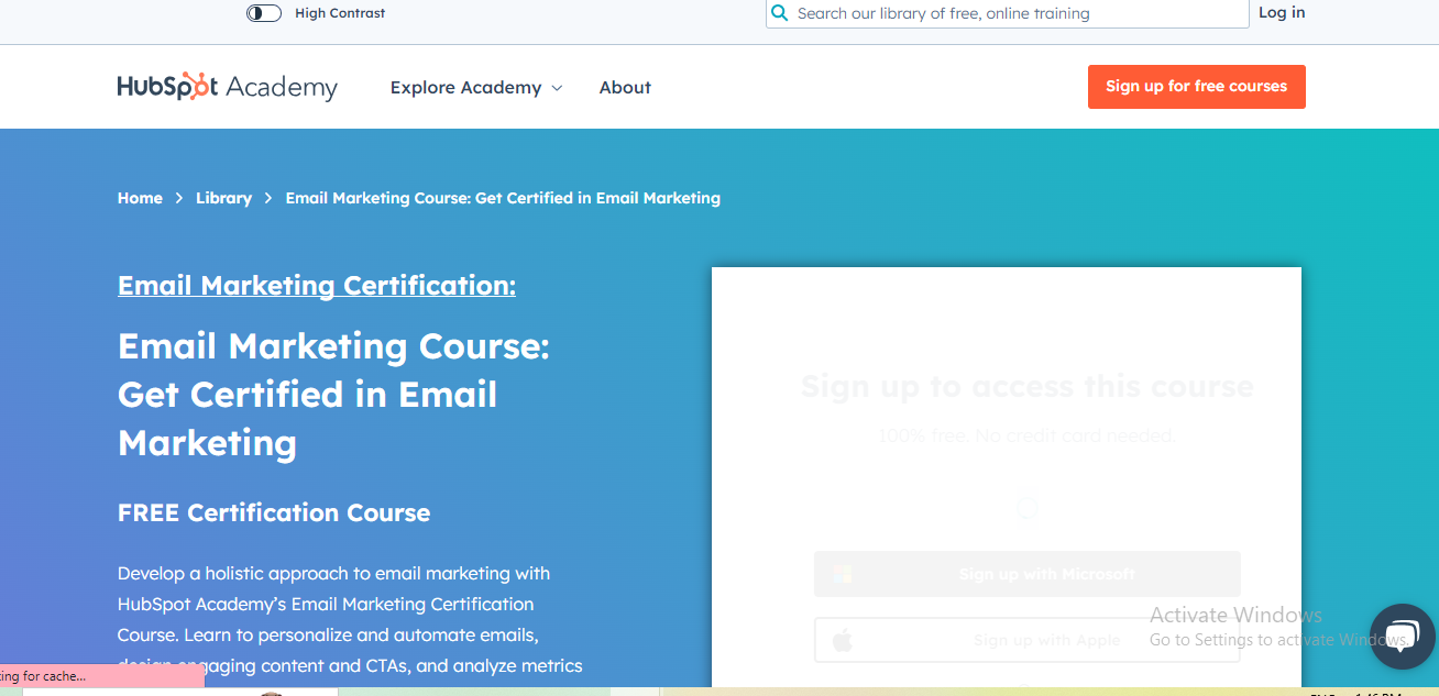The HubSpot Content Marketing Certification is available for free through the HubSpot Academy platform. The certification course consists of video lessons, practical exercises, and a final exam. The duration of the course is self-paced, allowing participants to complete the program at their convenience. On average, most participants complete the certification within a few days to a couple of weeks, depending on their study schedule and prior knowledge of content marketing concepts.