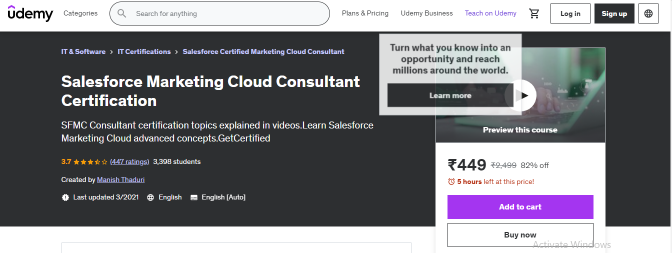 The cost and duration of the Salesforce Marketing Cloud Consultant Certification program may vary depending on enrollment options and study materials. The certification program typically consists of online courses, study guides, practical exercises, and a final exam. The duration of the program is self-paced, allowing participants to complete the coursework and prepare for the exam at their convenience. On average, most participants complete the certification within a few weeks to a couple of months, depending on their study schedule and prior knowledge of Salesforce Marketing Cloud concepts.