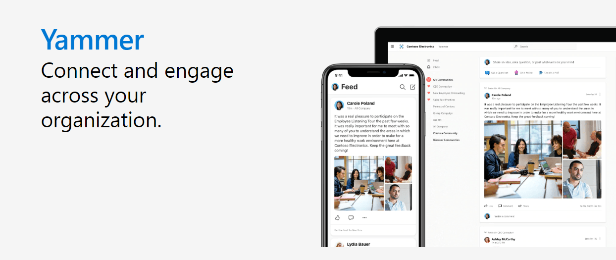 Improve engagement and enhance communication in your organization. Build communities of interest, gather ideas and feedback, and keep everyone informed, aligned, and moving forward with help from Yammer.
