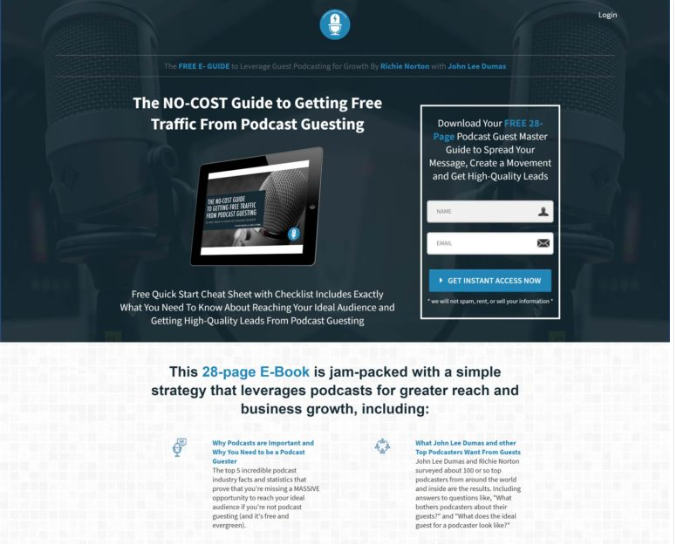 Podcasting Guest Mastery helps business owners get featured on podcasts to grow their audience. Their ClickFunnels landing page is focused on delivering value right away.