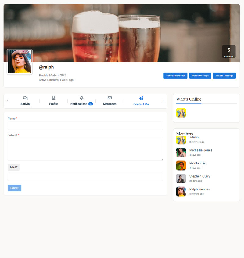 - Profile-Integrated Contact Forms: Each member can enable or disable a contact form on their profile, allowing visitors to reach out effortlessly.