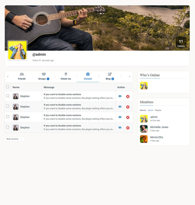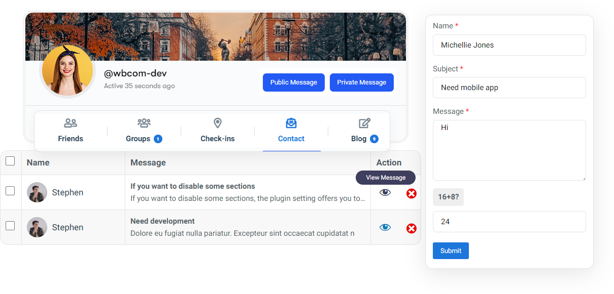- Comprehensive Message Logs: Members receive notifications via email and BuddyPress, with all contact submissions archived in a dedicated profile tab for easy reference.