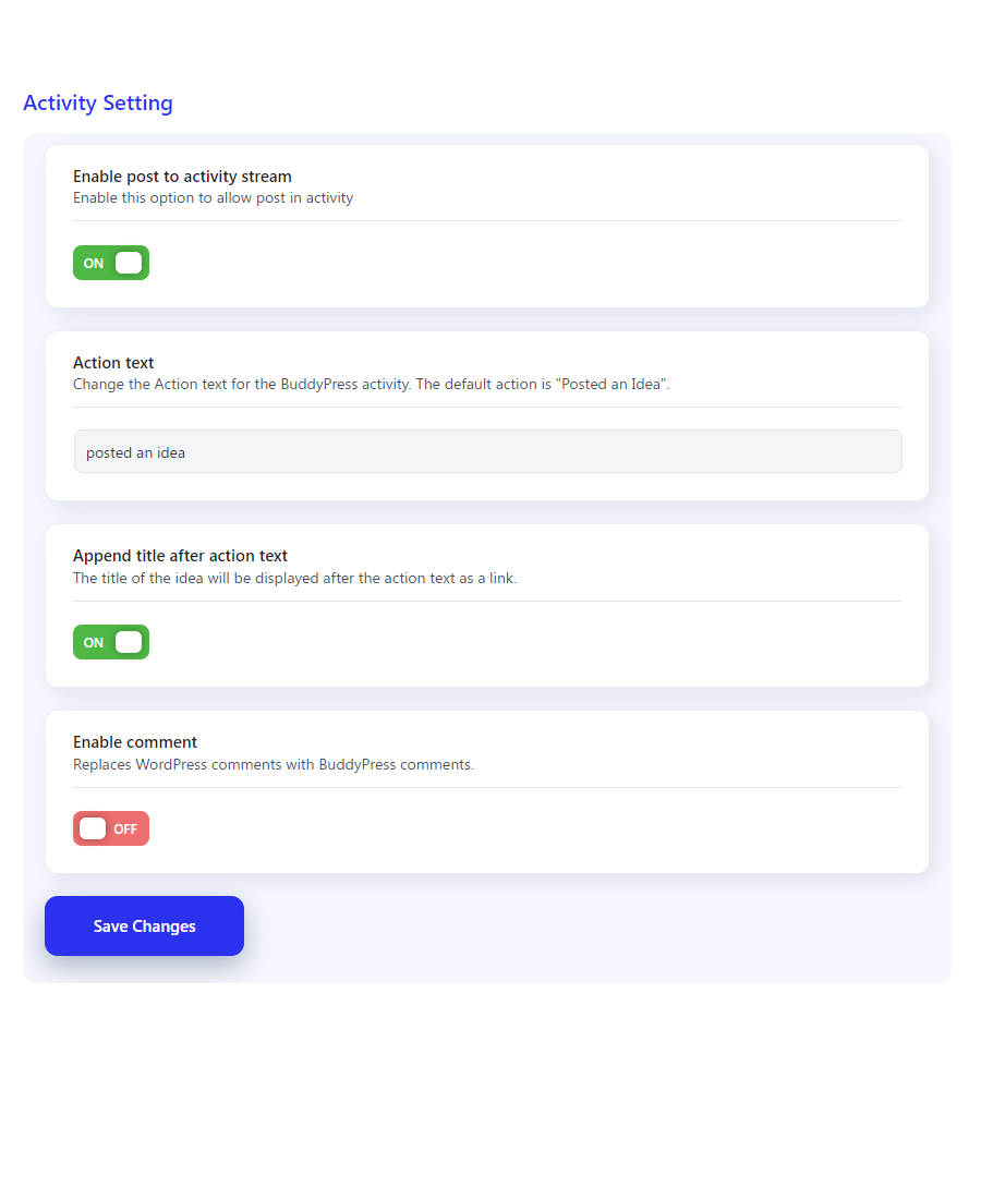 - Configuration settings to Show/Hide idea tab on BuddyPress Profile