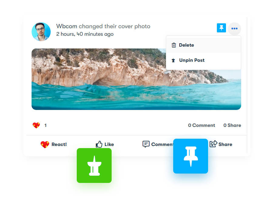 - Allows you to pin important updates inside buddypress group and BuddyPress activities.