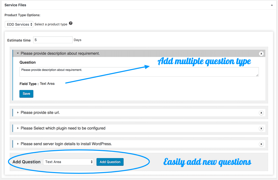 Vendors can add questions– Like Fiverr, this plugin had allowed sellers to add a set of questions that should be asked to the buyer to start with a service order. EDD Sell services can allow vendors to add questions that will be required to process service. Customers will be able to submit the required details to start order processing.