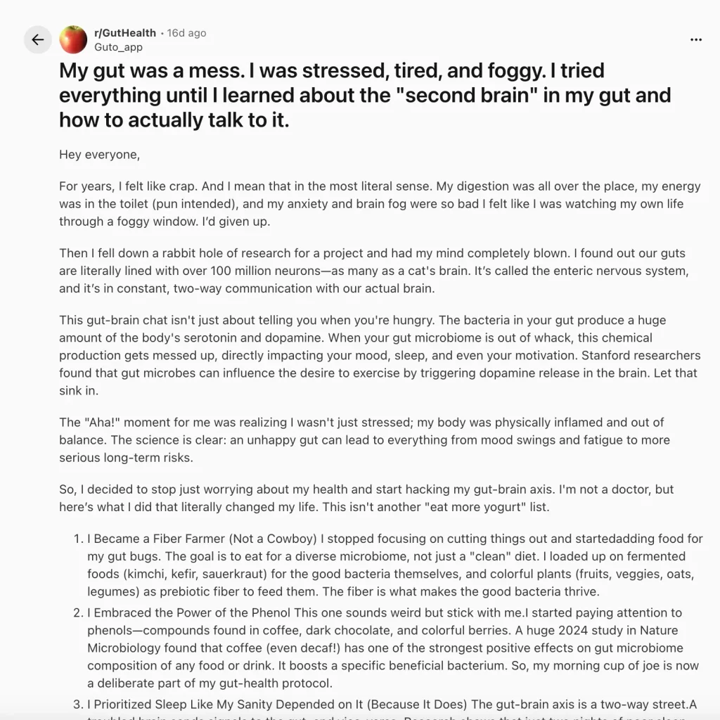 | My gut was a mess. I learned about the “second brain.” | A personal story about overcoming fatigue and anxiety through gut healing. | Brain fog, low energy, and stress linked to digestion. | gut-brain connection, gut health recovery, probiotics for energy |
