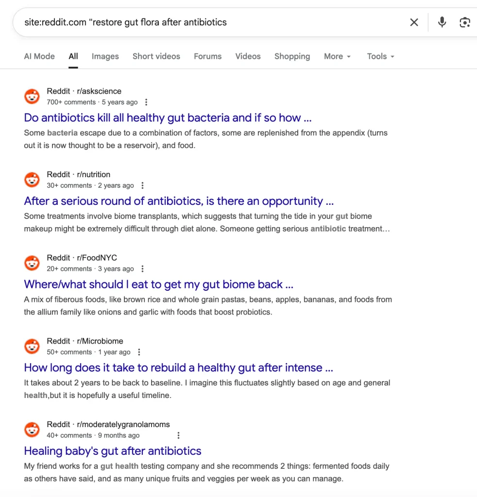 Redditors write exactly the way they think. Posts like “Why do probiotics make me bloated?” or “How long does it take to fix gut health after antibiotics?” show up again and again. These phrases may not always have huge search volume, but they reflect genuine curiosity. When you create content around these real questions, you’re speaking your audience’s language not just chasing keywords.