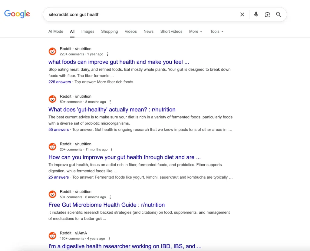 So I decided to run an experiment. I wanted to see if I could use Reddit discussions to uncover real, high-intent keyword opportunities in the gut health niche topics that reflect what people genuinely want to know but can’t find elsewhere.