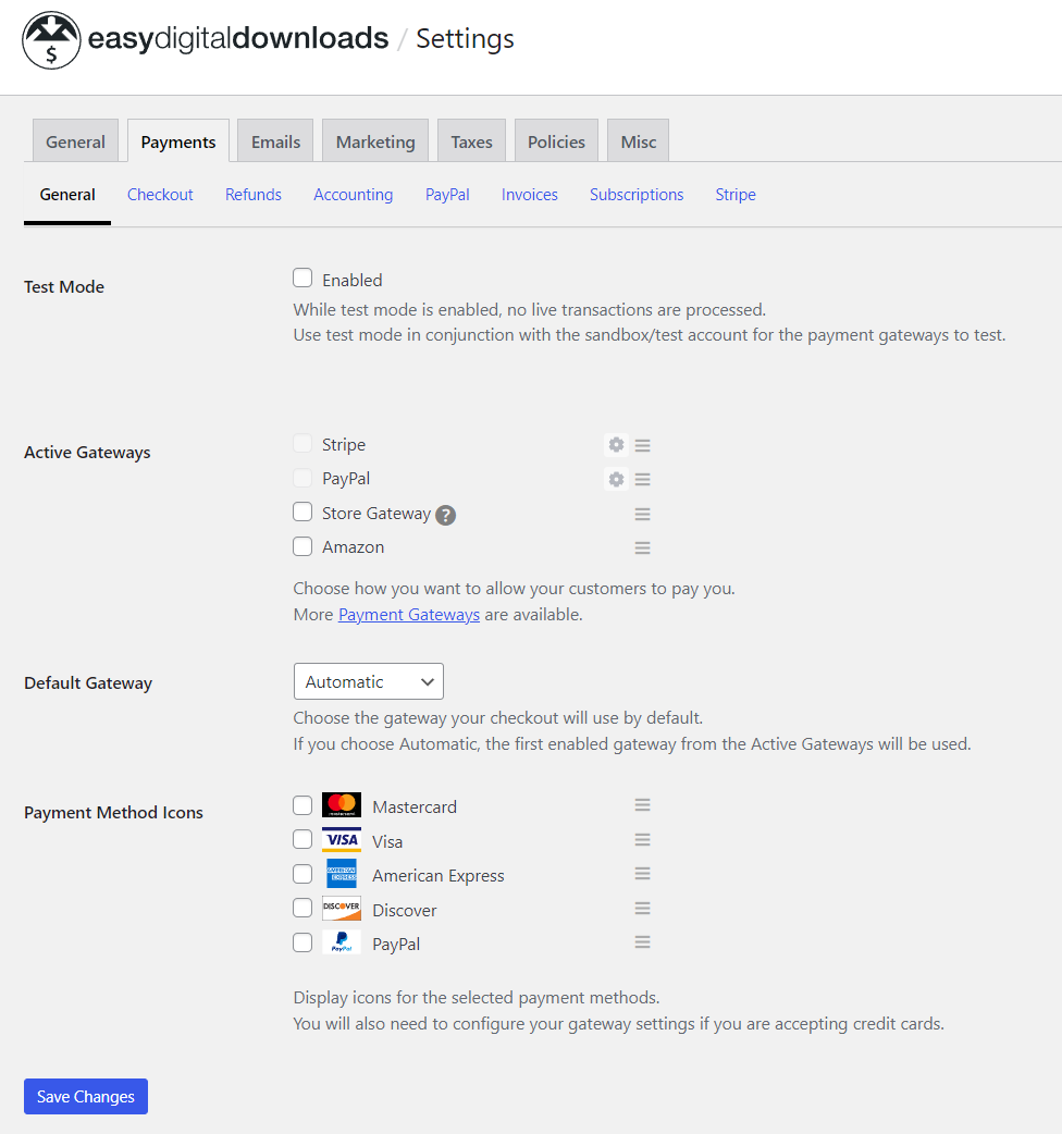 To accept payments from your customers for selling photos online with WordPress, you need to choose a payment method that works for you. Easy Digital Downloads supports many popular payment gateways like PayPal, Stripe, Authorize.net, Amazon Pay, and more.