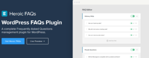 The Heroic FAQs plugin is a premium WordPress tool that allows you to easily create FAQs without any coding experience. It offers features like drag-and-drop ordering, multiple styles and icons, animations, and video support. You can organize your FAQs into unlimited categories, and display them anywhere on your website using shortcodes or Gutenberg blocks.