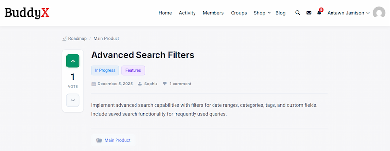 Track every feature as it moves from idea to planning, development, and completion. This clear workflow helps users understand what’s actively being worked on. It also keeps teams aligned and reduces repetitive status questions.