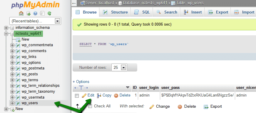 Edit your username inside wp_users look for the username for the account you want to edit. Then click the Edit button row: