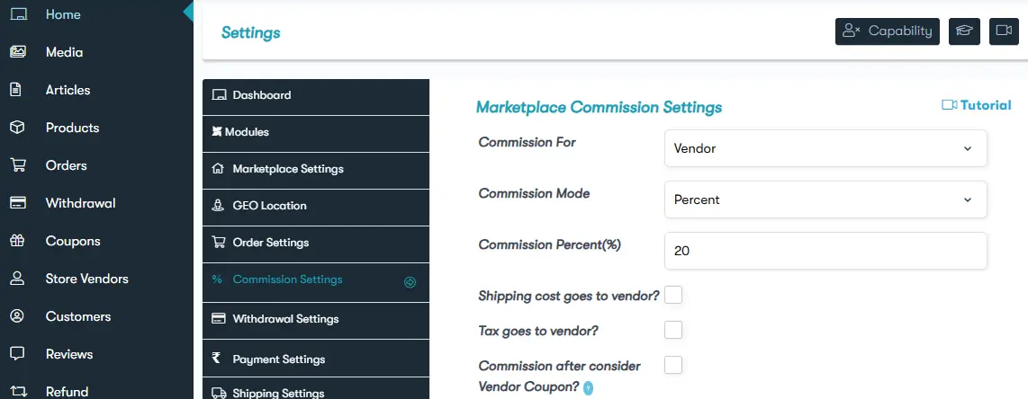 - Very flexible commission system. You can set commission parameters for both admins and vendors and create a commission policy.