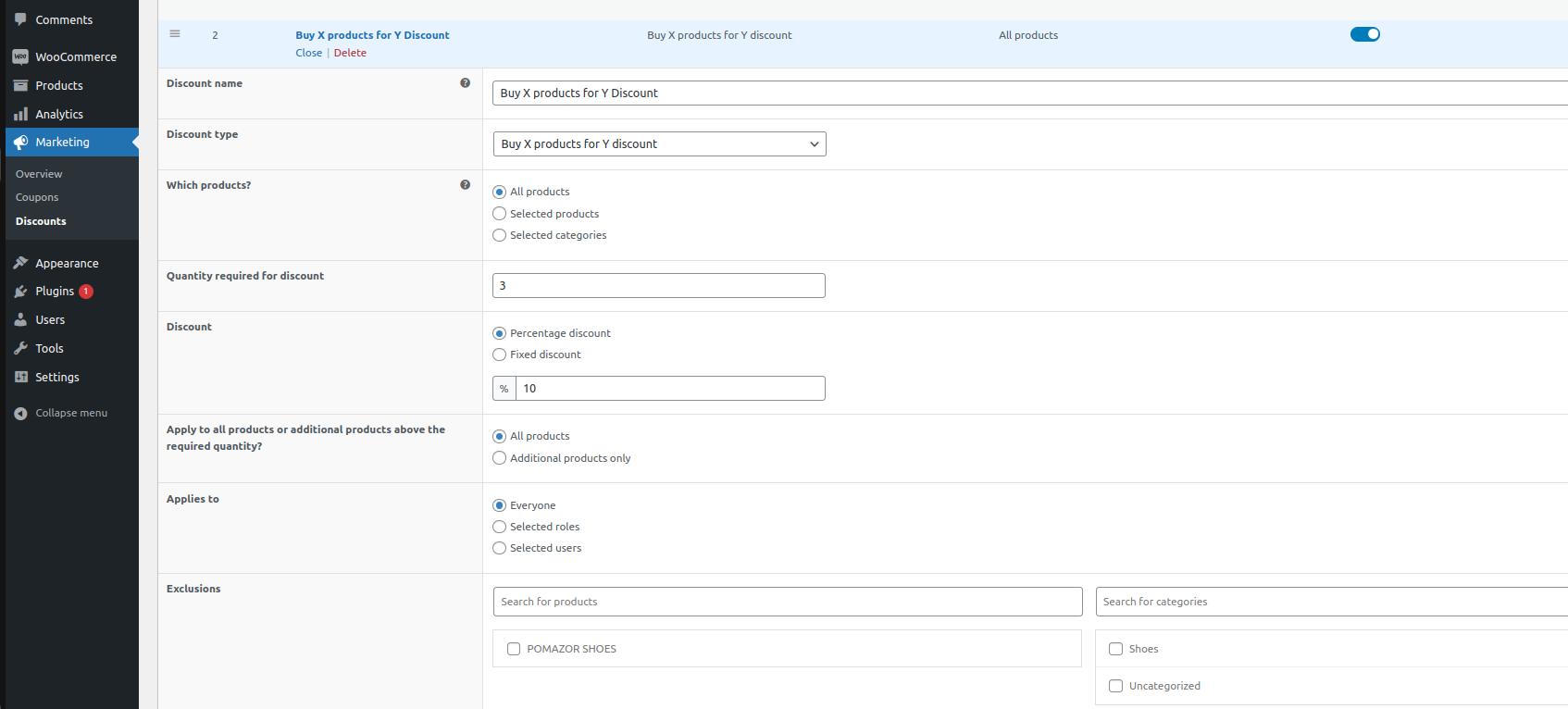 - Choose “Buy X Products for Y Discount” as the discount type.