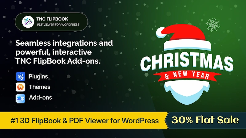 Enjoy a Christmas & New Year offer with 30% OFF on TNC FlipBook Addons. Create secure PDFs, interactive flipbooks, and intelligent document viewers with a premium addon collection. You will also get premium WordPress plugins and themes. From advanced PDF readers to WooCommerce-ready tools, every addon is optimized for performance and flexibility. Deliver a polished, secure, and high-converting experience with confidence.
