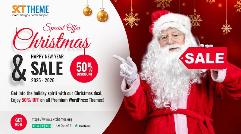 How better to start 2026 than by introducing a gorgeous, brand-new design for your website? Get the most benefit from the 50% discount discount on Christmas premium WordPress themes if you’re planning to build your own personal portfolio, blog, or online store. SKT Themes has the ideal theme.